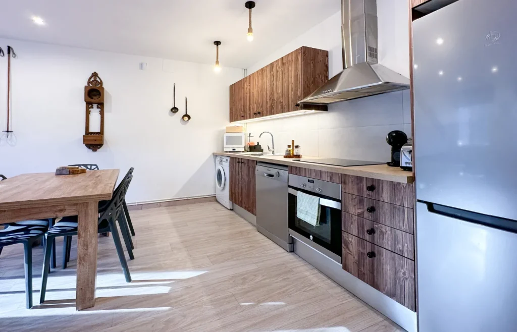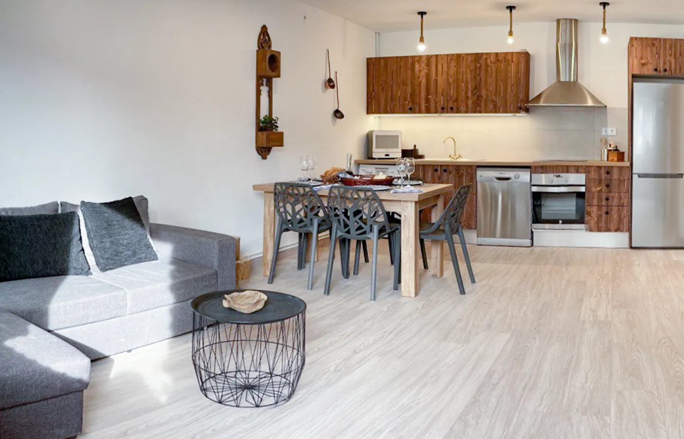 Amb una superfície de 75 m², l’apartament està dissenyat perquè et sentis com a casa. Gaudeix d’un ampli menjador amb sofà, televisió de pantalla plana i cuina/menjador, perfecte per relaxar-te després d’un dia d’aventures. La cuina totalment equipada et permet preparar els teus àpats amb totes les comoditats: nevera, forn, microones, cafetera i tots els estris necessaris.
